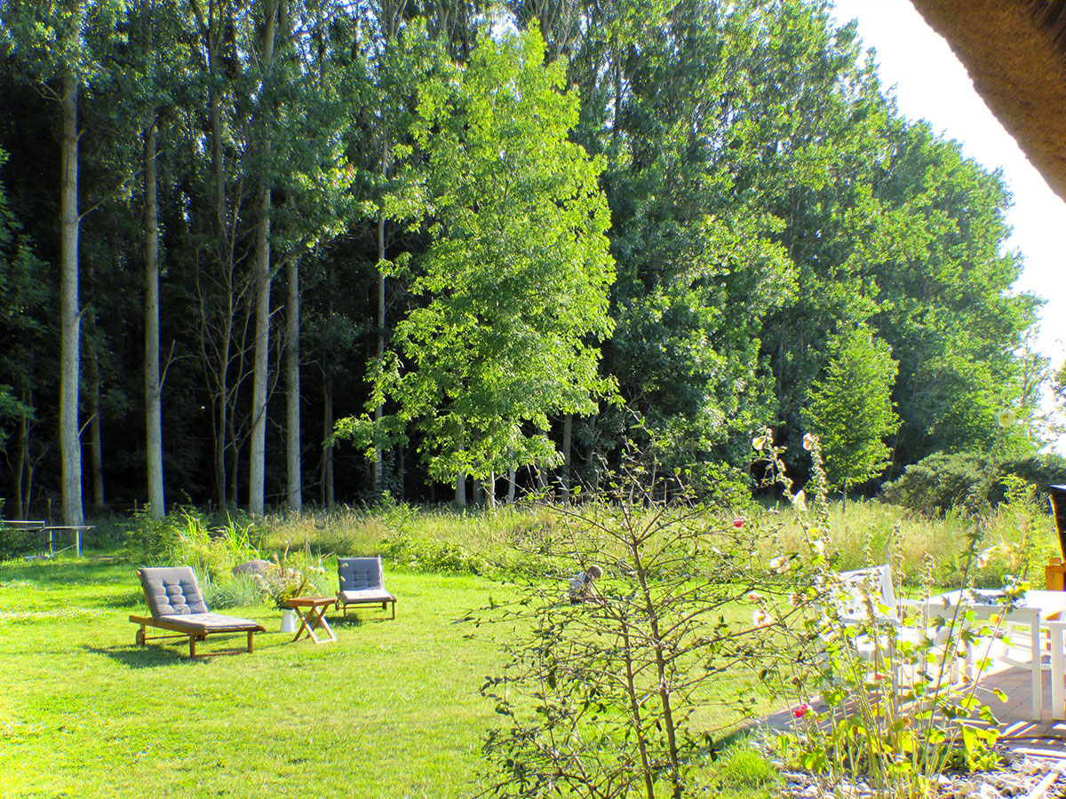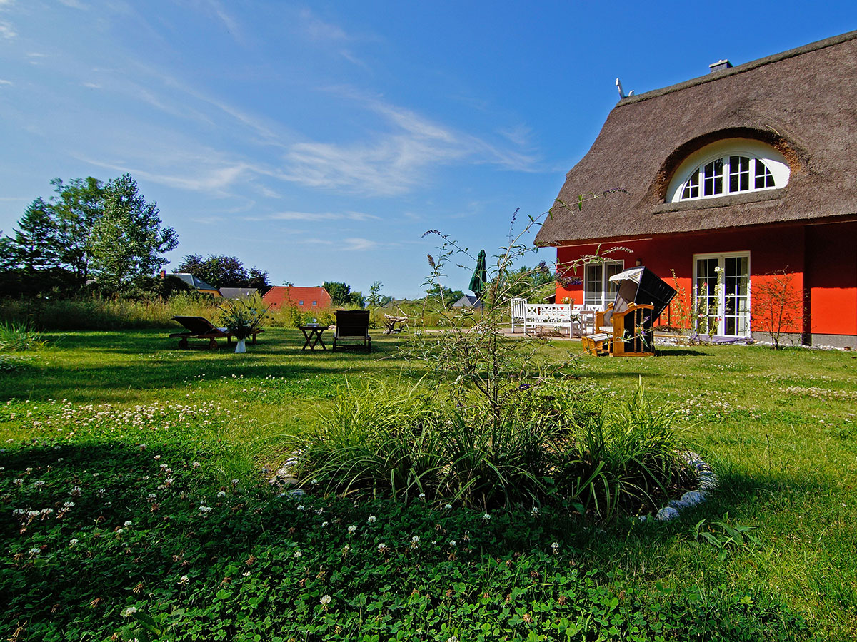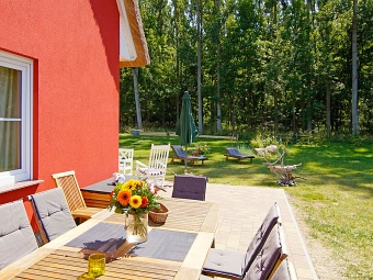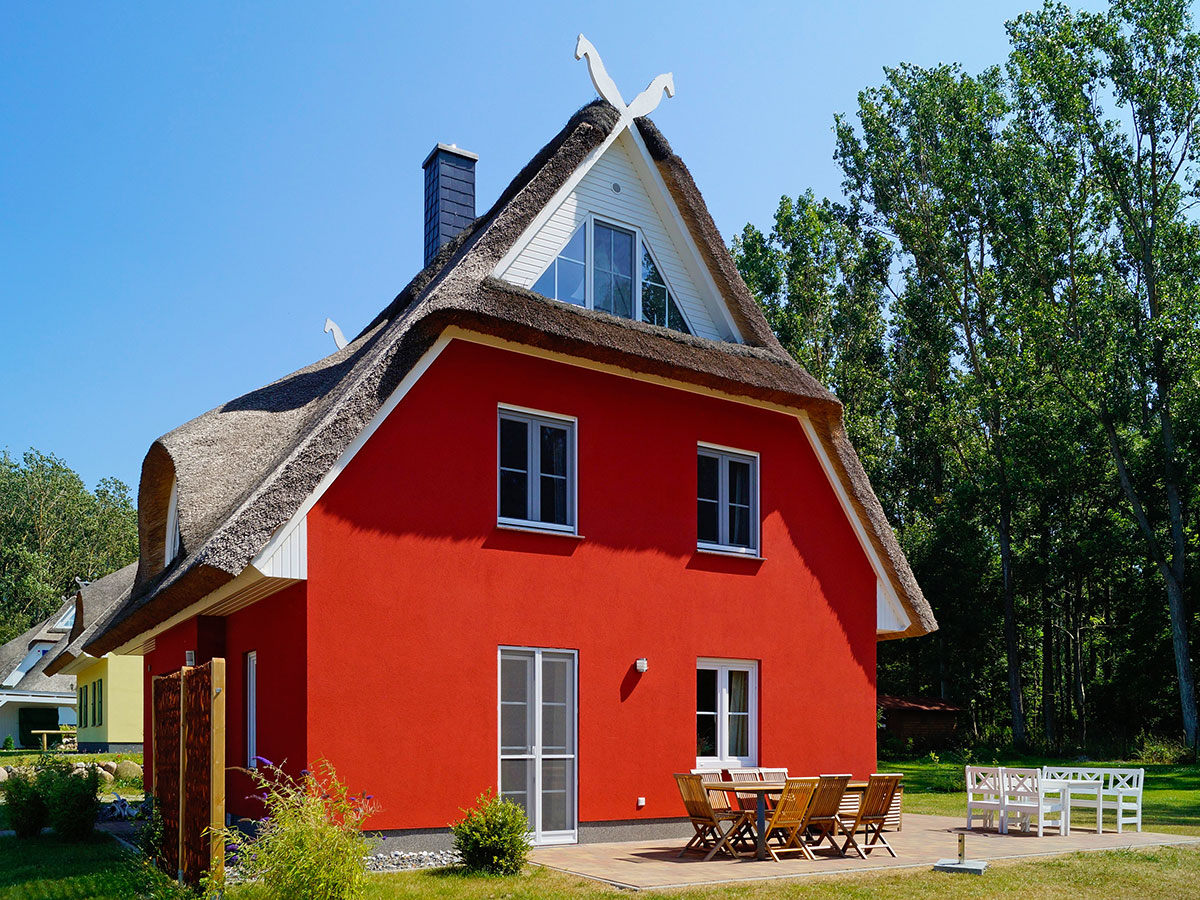 Das wunderschöne, großzügig eingerichtete Reetdachhaus Seeigel liegt im staatlich anerkannten Erholungsort Glowe auf der Insel Rügen im ruhigen und windgeschützten Teil des Ortes, unweit von Strand und Hafen. Das Haus befindet sich auf einem Endgrundstück direkt am Waldrand im neu errichteten Ostseepark Glowe. Die Lage des Hauses wird Sie für den längsten Anfahrtsweg im Ferienpark mehr als entschädigen. Wenn Sie das etwa 1100m² große Grundstück betreten, tauchen Sie in eine andere Welt ein. Nach Westen öffnet sich Ihnen der Blick über ursprüngliches Grasland mit großen Sanddornbüschen. Hier kann man auf der Terrasse wunderschöne Sonnenuntergänge erleben. Die Südterrasse lockt zum Frühstücken im Freien. Die großen Abstandsflächen zu den Nachbargrundstücken garantieren Ihnen die Ruhe, die Sie zum Erholen brauchen. Auf den Grünflächen laden Liegen zum Relaxen ein. Gönnen Sie sich ein gutes Buch, ein Glas Wein oder einfach die Sonne. Ein Strandkorb hilft Ihnen bei kühlerem Wetter, die Natur zu genießen. Hainbuchenhecken grenzen nicht ab, sondern machen neugierig auf das, was sich dahinter verbirgt, ideal für Kinder zum Versteckspiel. Eine Tischtennisplatte animiert zur Bewegung an frischer Luft und in ruhigen Zeiten sorgen die wilden Nachbarn, wie Hase und Hirsch, für Abwechslung auf dem Grundstück.